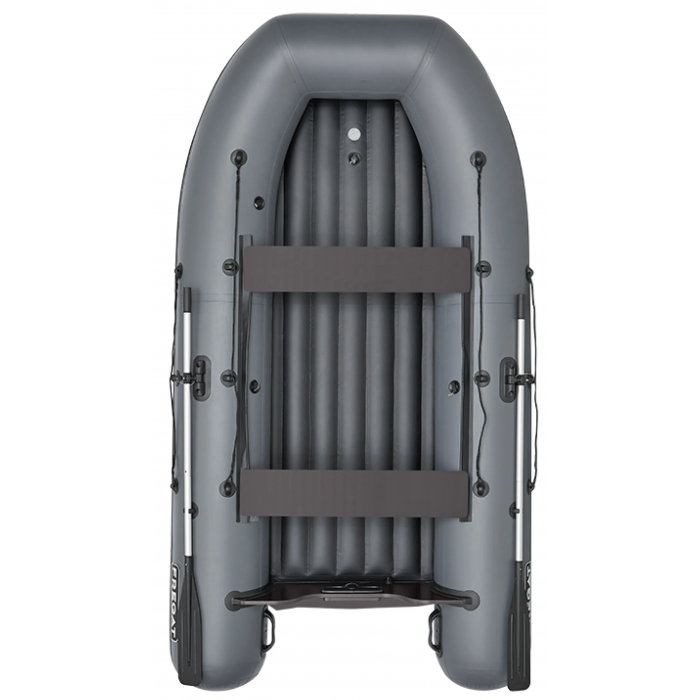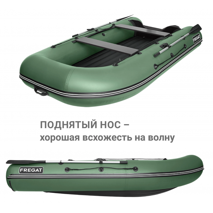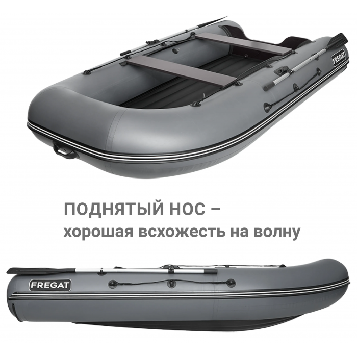 Фрегат 330 Air — это беспайольная моторная лодка ПВХ с надувным дном низкого давления, длиной 3,30 м под мотор до 15 л. с., рассчитанная на 5 пассажиров. Фрегат Air — серия надувных моторных лодок с НДНД, надежных и прочных, с отличной маневренностью и управляемостью. Они предназначены для рыбалки, охоты и активного отдыха на воде. Благодаря жестко вклеенному надувному килевому дну в лодках Фрегат Air отсутствует пайол из фанеры, в отличие от лодок серий EK, C, F, PRO. За счет этого лодки этой серии имеют значительно меньший вес при одинаковой длине. Подготовка лодки серии Air к спуску на воду занимает 10 минут, достаточно накачать отсеки до рабочего давления. Сборка такой лодки заключается в открытии клапанов и простом сворачивании в сумку. Комплектация: Лодка, весла, сумка, паспорт, ножная помпа (насос), ремкомплект. В сложенном состоянии надувная лодка перевозится в одной упаковочной сумке.