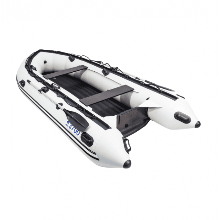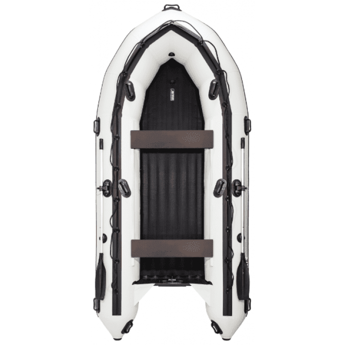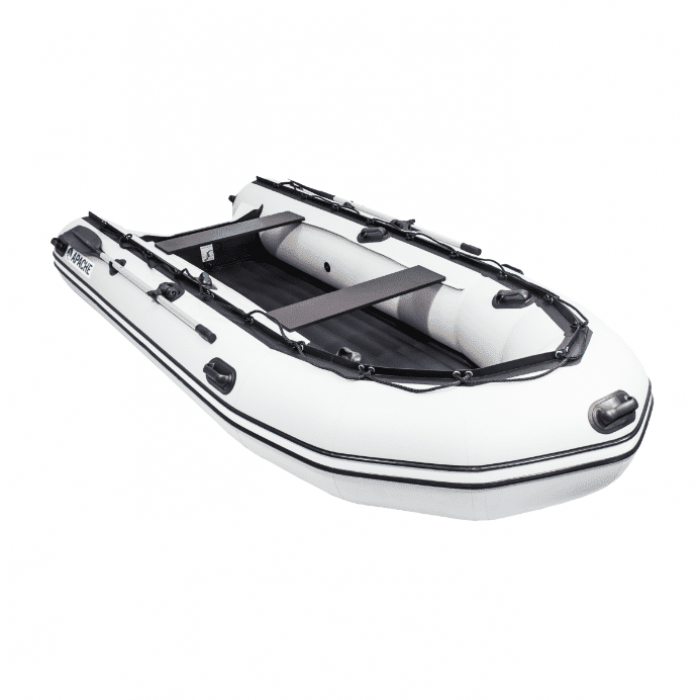 Лодка Apache 3700 НДНД четырехместная лодка с надувным дном низкого давления, с усилением кокпита призмой и днища плоским привалом. Серия лодок Apache направлена на увеличение комфортности и универсальность. Кокпит довольно глубокий и оснащен 4-мя ручками за которые удобно держаться при движении. Широкие баллоны 48см способствуют тому что лодка довольно стабильно и уверенно идет по воде. В серии лодок Apache применяется новая форма надувного дна, которая обеспечивает более легкий выход на глиссирование и лучшую управляемость. В носовой части дно килевое, плавно переходящее в гидролыжу к транцу. Семиугольная конструкция носовой части обеспечивает равномерное распределение нагрузки на ткань – повышает эксплуатационные характеристики. Комплектация: