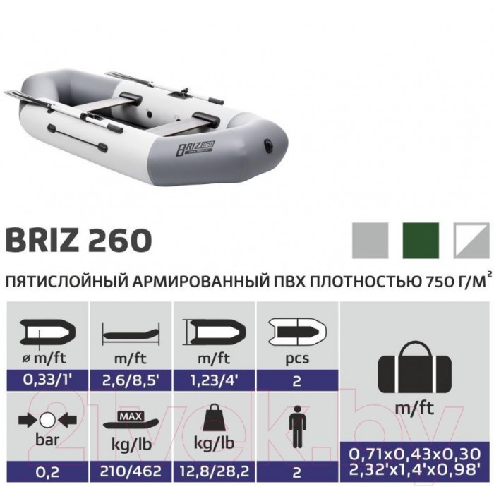 Дополнительная комплектация весло (2 шт.), насос (5 л.), ремкомплект, сумка упаковочная, руководство по эксплуатации (паспорт), банка (сиденье) (2 шт.)