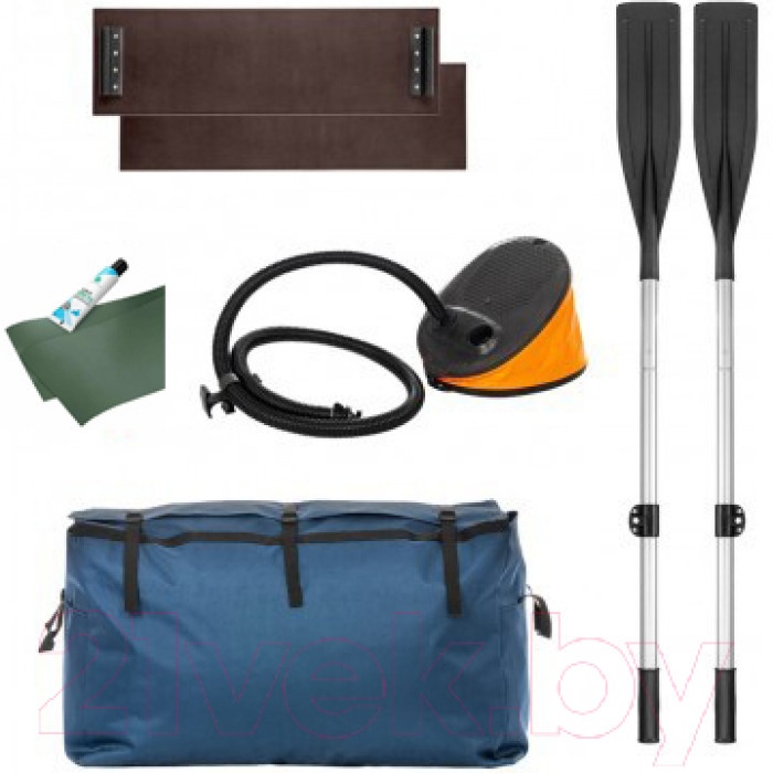 Дополнительная комплектация весло (2 шт.), насос (ножной 5 л), ремкомплект, сумка упаковочная (81×53×32 см), руководство по эксплуатации (паспорт), банка (сиденье) (2 шт.)