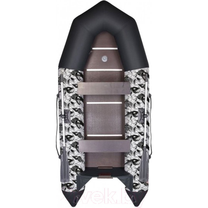Популярная модель лодки с эксклюзивным принтом «Хищная рыба». Необычный дизайн является не только особым видом камуфляжа, но и выделит вашу лодку среди других на водоеме. Моторно-гребная лодка Т310 — это легкая и вместительная лодка. Просторный кокпит лодки и грузоподъемность позволяют комфортно разместиться пассажирам и расположить весь необходимый груз. За счет оснащения лодки килеватым днищем улучшается ее управляемость, обеспечивается плавное всхождение на волну, что позволяет уверенно глиссировать с мотором до 8 л.с. Рекомендованные районы плавания: прибрежная зона, реки и озера. Пол толщиной 9 мм, изготовленный из водостойкой фанеры с противоскользящим покрытием, позволяет уверенно перемещаться в лодке и рыбачить стоя. Крепление сидений ликтрос–ликпаз позволяет регулировать банки в большом диапазоне, что обеспечивает удобство размещения людей и груза в лодке. Лодка оснащена ребордой (привальным брусом), защищающим боковую часть бортов при швартовке. По бортам лодки размещены ручки для ее переноски. Высококачественные клапана позволяют быстро надуть/сдуть лодку и являются надежной защитой от стравливания воздуха. В сложенном состоянии лодка перевозится в одной упаковочной сумке.