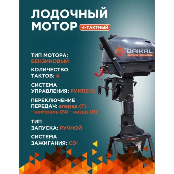 Обновленная версия. Линейка моторов BAIKAL "PRO SERIES" - это увеличенная мощность (6 л.с.), надежность и гарантия комфортного отдыха на воде! Четырехтактный подвесной лодочный мотор BAIKAL изготовленный с использованием японских технологий имеет простую конструкцию, благодаря чему обладает высокой надежностью и простотой в обслуживании. Ручка акселератора находится на румпеле. Очень надежный и экономичный мотор, а по соотношению мощности и расхода топлива обходит многие более дорогие аналоги. Мотор оснащен встроенным баком и коннектором под дополнительный внешний бак. Система водяного охлаждения двигателя эффективно справляется со своей задачей, что позволяет поддерживать высокие обороты двигателя в течении длительного времени без риска перегрева мотора. Скоростные показатели Данный двигатель с 1 человеком на борту позволяет без труда выходить на глиссирование. Для сравнения моторов по скоростному потенциалу в зависимости от мощности, можно примерно оценить развиваемую скорость, учитывая то допущение что средний вес человека 80 кг., а лодка плывет по гладкой воде без течения и в отсутствии ветра. Для данного двигателя будут следующие скоростные показатели: Комплектация: