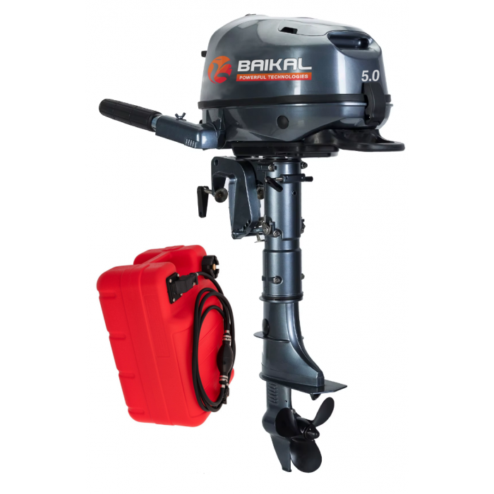 Четырехтактный подвесной лодочный мотор BAIKAL 5 HP изготовленный с использованием японских технологий имеет простую конструкцию, благодаря чему обладает высокой надежностью и простотой в обслуживании. Ручка акселератора находится на румпеле. Очень надежный и экономичный мотор, а по соотношению мощности и расхода топлива обходит многие более дорогие аналоги. Мотор оснащен встроенным баком и коннектором под дополнительный внешний бак. Система водяного охлаждения двигателя эффективно справляется со своей задачей, что позволяет поддерживать высокие обороты двигателя в течении длительного времени без риска перегрева мотора. Скоростные показатели Данный двигатель с 1 человеком на борту позволяет без труда выходить на глиссирование. Для сравнения моторов по скоростному потенциалу в зависимости от мощности, можно примерно оценить развиваемую скорость, учитывая то допущение что средний вес человека 80 кг., а лодка плывет по гладкой воде без течения и в отсутствии ветра. Для данного двигателя будут следующие скоростные показатели: Комплектация: