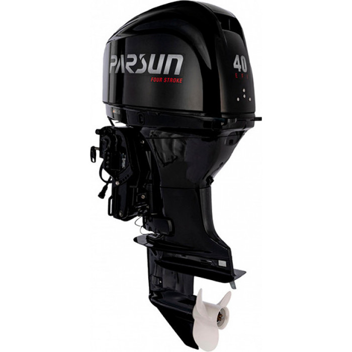 F40FES-T-EFI — является полным аналогом японского лодочного мотора Yamaha. Все их запчасти взаимозаменяемы, в связи с чем эксплуатация и техническое обслуживание мотора существенно упрощается. Данная модель мотора имеет дистанционное управление, электрозапуск и оборудована системой электрогидравлической откидки и наклона. Мотор предназначен для лодок с транцем – 381 мм. Силовой агрегат Парсун F40FES-T-EFI представляет из себя 4‑х тактный 3‑х цилиндровый двигатель с объемом цилиндров 747 куб. см. На каждый цилиндр приходится по два клапана. Их приводит в действие один распредвал с ременным приводом, который расположен перед блоком цилиндров – конфигурация SOHC.Топливо к впускным клапанам подается инжекторами, которые являются частью инжекторной системы многоточечного впрыска (Multi-Point EFI). Всеми системами двигателя, включая систему электронного впрыска топлива, систему электронного зажигания CDI/TCI и систему предупреждения о неисправностях, управляет микропроцессорный электронный модуль ECM. Он в режиме реального времени опрашивает многочисленные датчики, расположенные в ответственных узлах двигателя, и производит расчет оптимального количества топлива, требуемого для подачи в камеры сгорания. Чтобы снизить вероятность поломки двигателя подвесного мотора F40FES-T-EFI, система оповещения о неисправностях Engine Alert System своевременно информирует судоводителя о перегреве, снижении давления масла и других неисправностях. Модели моторов, оборудованные системой электрогидравлической откидки/наклона, позволяют точнее настраивать угол наклона на ходу, при преодолении мелководных участков и при причаливании к берегу. Выход на 12 вольт (постоянный ток 12~15 V 25 A ) для подключения ходовых огней; реализации питания эхолота/навигатора, подзарядки мобильного телефона и прочих приборов.